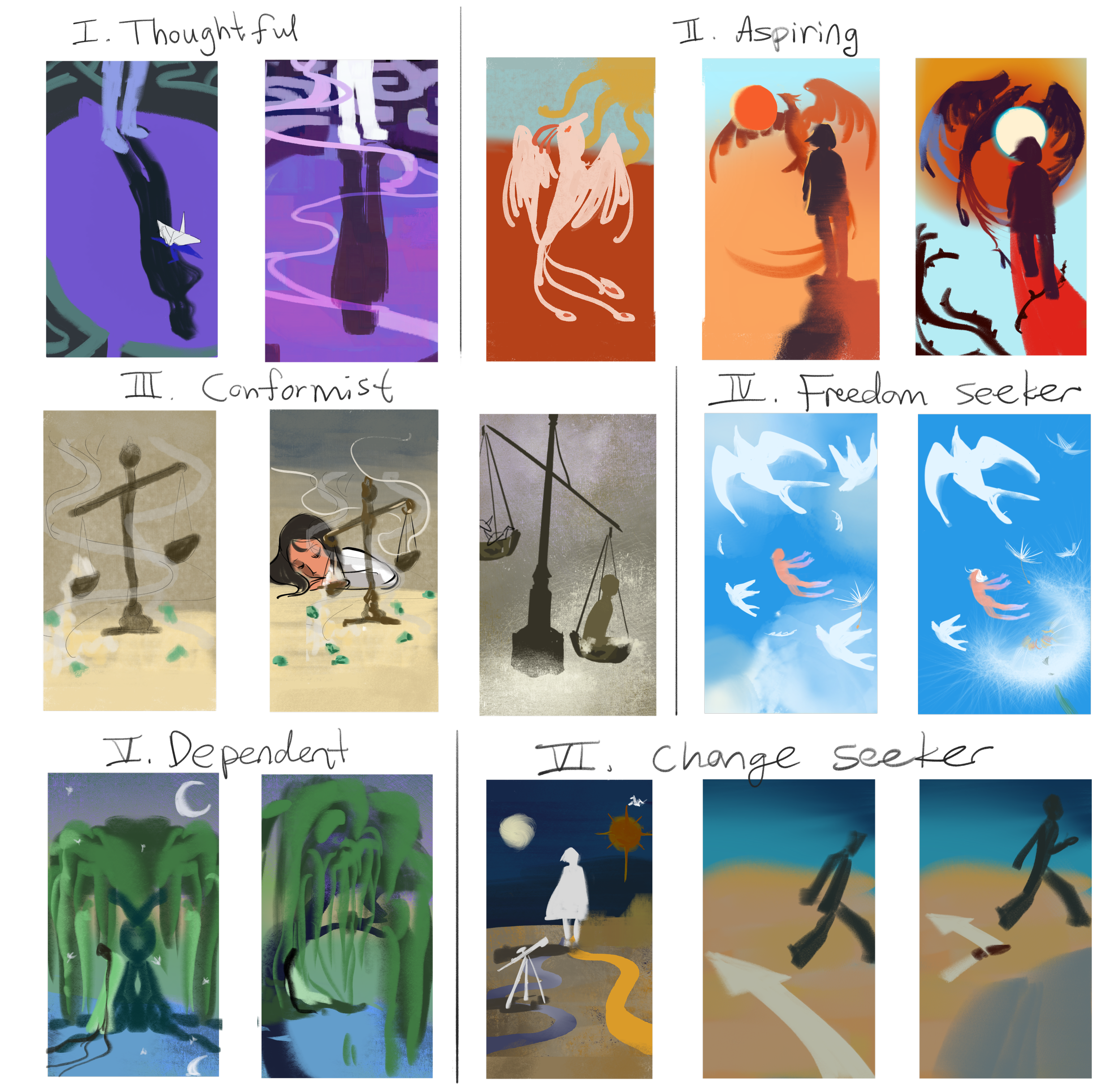 In my concept sketch, I brainstormed symbolic objects that enable the audience to intuitively pick the right card representing their own values.