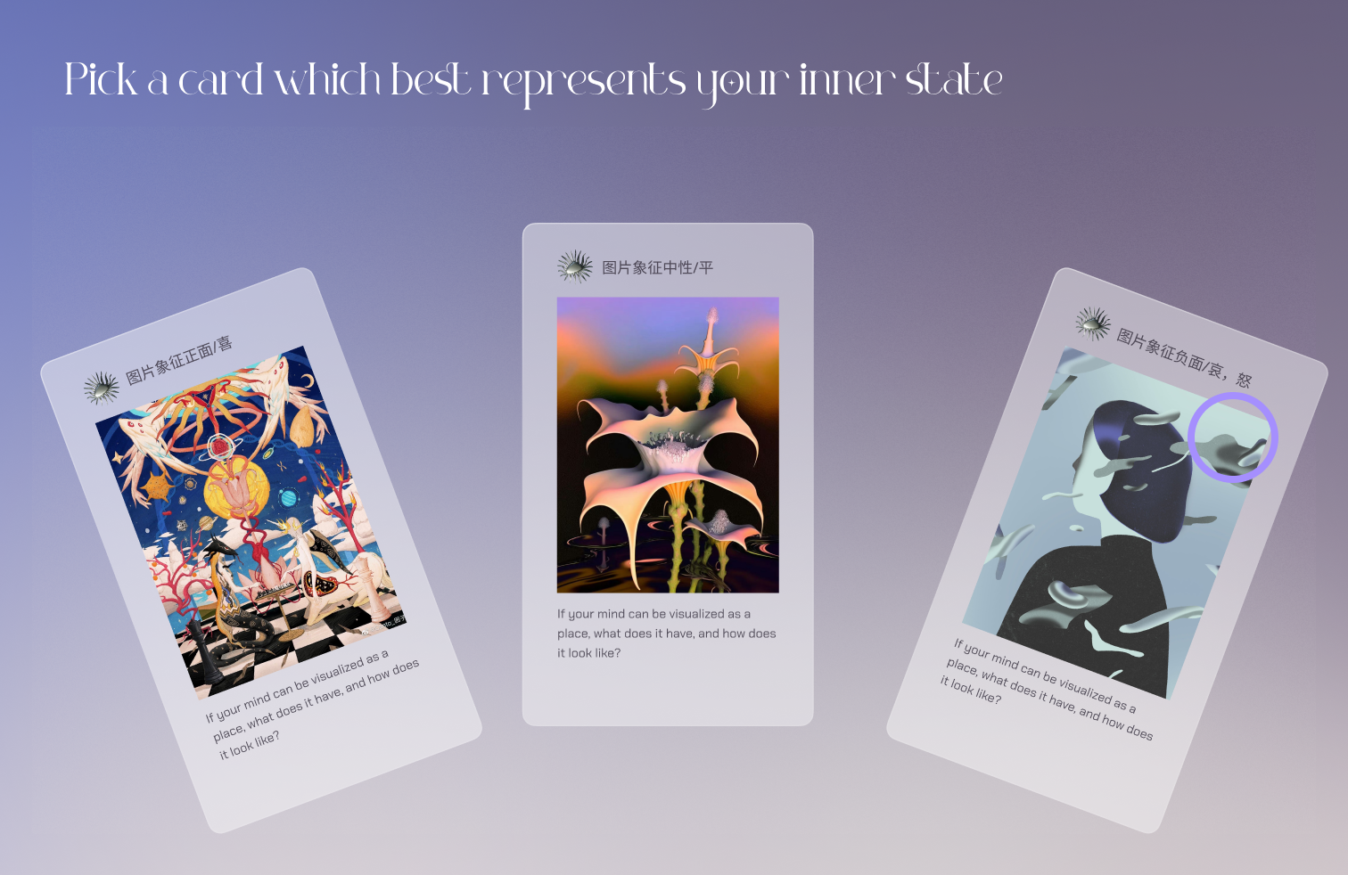 The audience project their interpretation onto the cards’ imagery. The 3 mindsets they identify with determine which 3 corresponding experiences they will see in the VR narrative.