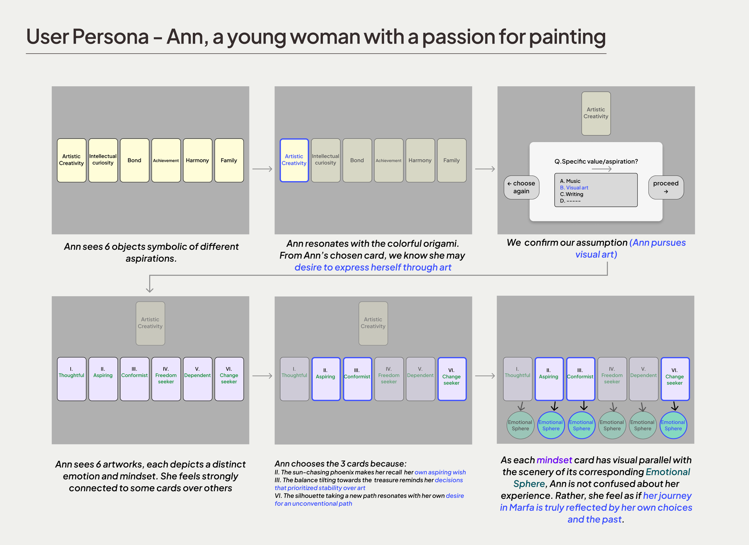 Prototype introduction showcasing Ann picking a card corresponding to her artistic dreams.